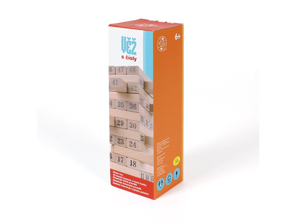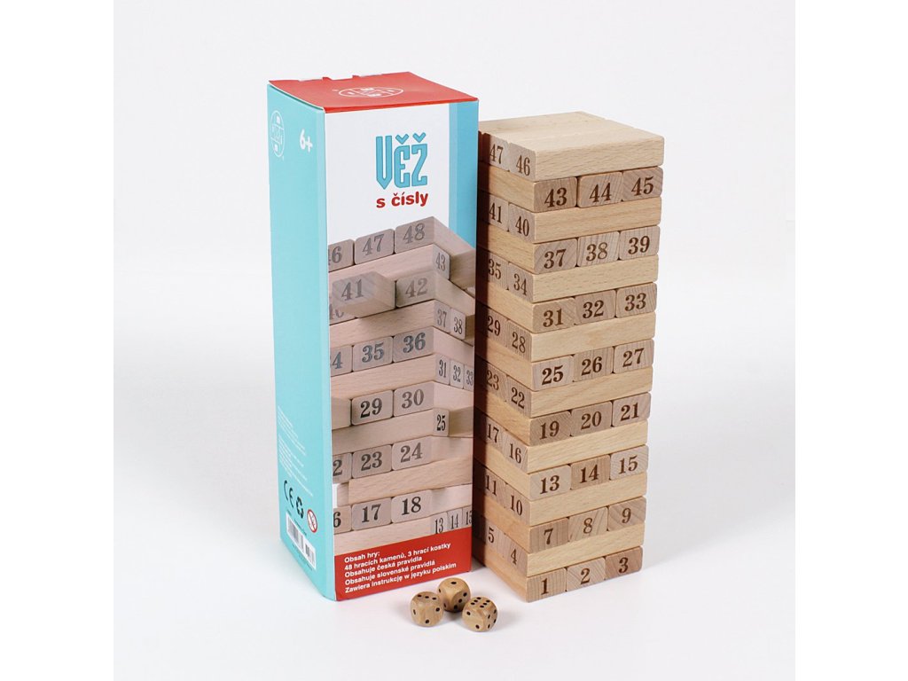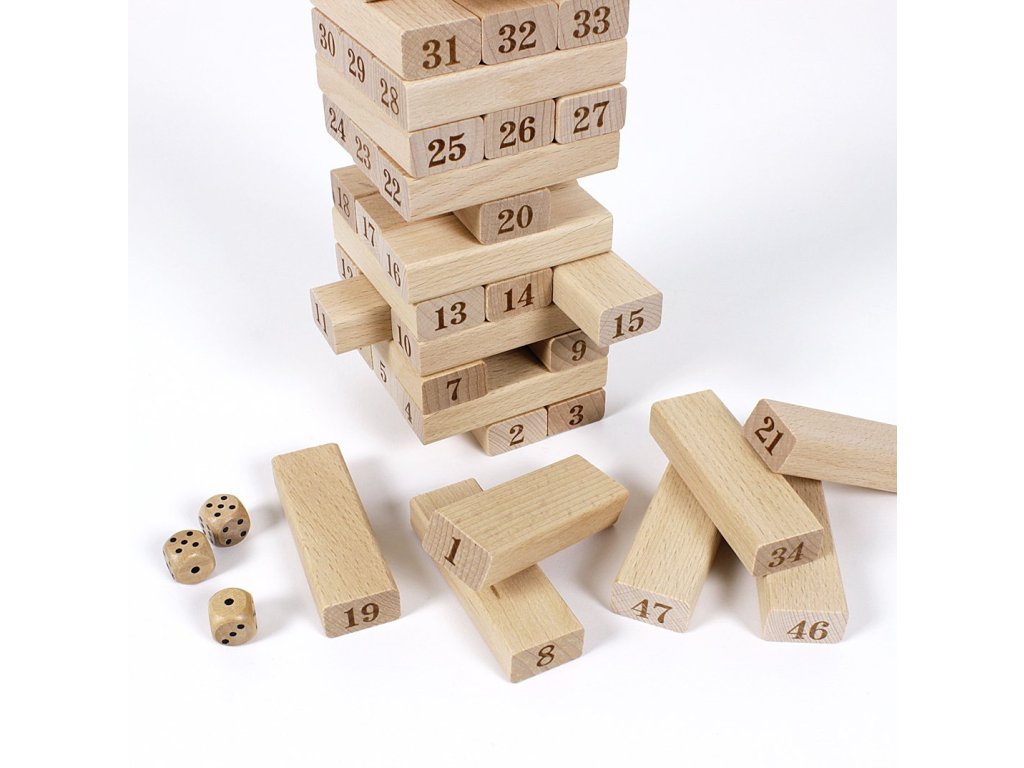 Známá hra Věž s čísly na dřevěných kamenech pro ještě větší vyžití ze hry. Součástí hry jsou také hrací kostky, se kterými lze hru "oživit". Hodnoty na kostkách můžete například sčítat nebo násobit a podle toho tahat kameny z věže.Doplňkové parametry